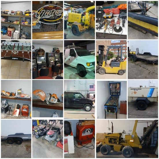 Vans, Trailers, Forklift, Chipper/Shredder, Trencher, Diesel Air Compressor, Scooters, Collectibles, Pin Ball Game/Slot Machines, Tools, Equipment & So Much More!!