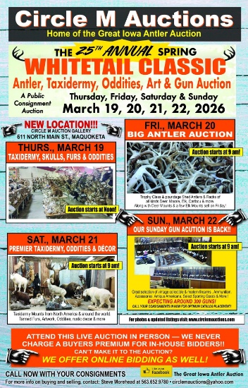 Taxidermy Oddities Rustic Decor & More Day 1 - Thursday March 19, 2026 at 12PM. The Great Iowa Antler Auction Day 2 Friday March 20, 2026 at 9AM. Premier Taxidermy Fine Art Oddities & More Day 3...