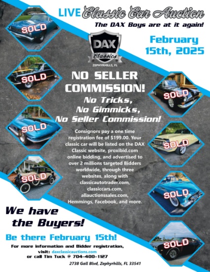 DAX is partnering with Ted Vernon's South Beach Classics for this SPECIAL NO RESERVE Auction! Everything Must Go! Over 150 Classic Cars, Trucks, Hot Rods and Motorcycles! Selling at No Reserve!!...