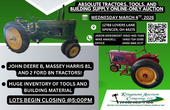4 RESTORED TRACTORS! JOHN DEERE B (WITH 3 POINT AND PTO!), MASSEY HARRIS 81, AND 2 FORD 8N'S! NEW OLD STOCK BUILDING MATERIALS (VANITIES, HOT WATER TANKS, DOORS, ETC), HAND TOOLS, POWER TOOLS, AIR...